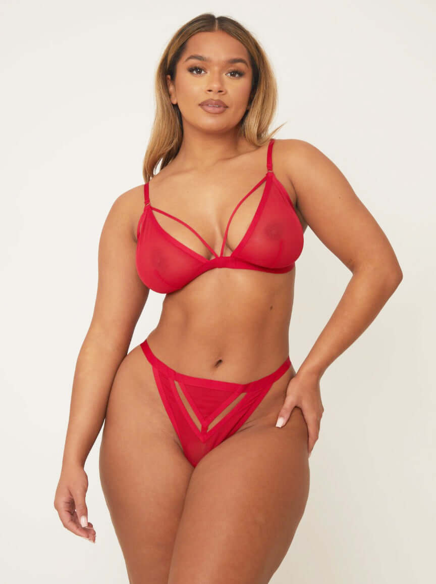 Meet Charli – your go-to for that "just threw this on but still slaying" energy. In Chilli Red, this set is turning up the heat with soft sheer mesh, cheeky caged cups, and a plunging neckline that says I woke up like this (but make it 🔥). Oh, and did we mention? She’s made from eco-friendly fabric – so you can feel as good as you look. 💋