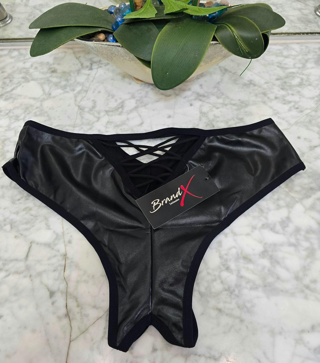 This sleek, crotchless knicker features a crossover front and a caged back in a bold "wet look" finish. Easy to slip on and sure to impress, it’s the perfect way to kick off some fun once it’s unveiled.