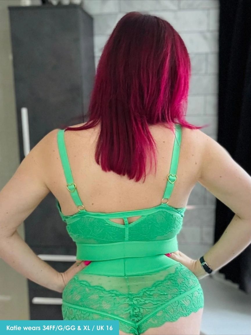 Meet Gia—your new green goddess. In stunning Harlequin Green, this bralette & brief set is equal parts flirty and fabulous. The bralette features Tutti Rouge’s signature lace with cheeky caged detailing on the cups, plus a soft underband that gives you natural lift and all-day comfort. Adjustable straps with heart sliders add that playful Tutti touch.